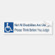 Não todas as inabilidades são visíveis. Pense por favor antes que você julgue. Há tanto um julgamento negativo neste mundo. Eu obtive doente da vista e da leitura sobre as pessoas que estão sendo abusadas porque estacionaram em um parque de estacionamento da inabilidade e algum desconhecido decide lhes dizer fora. Uma etiqueta não pode fazer muito mas pôde ajudar pessoas a pensar. Uma etiqueta de cada vez nós poderíamos fazer ao mundo um lugar mais amável.