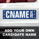 Adesivo de para-choque com o nome do seu candidato personalizado e ano. Texto branco ladeado por estrelas brancas e vermelhas em um fundo azul. Preencha com o nome do seu candidato político favorito.