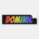 Este design de adesivo vibrante, multicolorido e divertido para-choques apresenta o nome comum "DOMÍNICO" com as letras que têm um espectro colorido do arco-íris como um padrão de coloração gradiente. O fundo é preto colorido. Pode ser um presente divertido dar a alguém chamado Dominic. [~Z0000343]