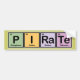 O pirata da palavra soletrou usando os quadrados coloridos que representam elementos da mesa periódica. Uma ideia bonito do presente para qualquer um que piratas dos amores, especialmente se igualmente têm um interesse na ciência ou na química. Excelente para a "conversa como um dia do pirata" demasiado! Fósforo + Iodo + Rádio + Tellerium = pirata