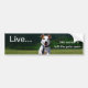 Um autocolante no vidro traseiro de inspiração que caracteriza uma foto bonita, vibrante de um cão que limita através de um campo, com uma expressão da alegria e liberdade pura, e a frase: "Vivo… como alguém deixou a porta aberta."