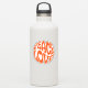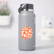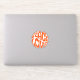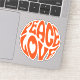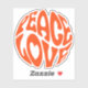 Um adesivo circular com as palavras Paz e Amor em laranja num fundo branco. O coração forma dentro a letra O apaixonada.