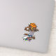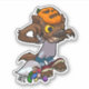 Um adesivo de contorno com um lobisomem fofo fazendo sua pose mais feroz. Um truque ou tratamento para o jovem com uma máscara de abóbora, transformado pela lua de cheio; pés peludos que explodem a partir das suas botas, seu saco de doces, cobras de geleia e bananas de espuma espalhadas no chão. Para fãs de Halloween e horror.