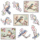 Uma folha com adesivos recortados personalizados de nove imagens de aquarela com um pássaro num galho com flores. Selecione o tamanho desejado e comece a decorar seu planejador, álbum de vendas, diário de lixo ou qualquer artesanato de papel.