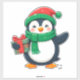 Um pinguim adorável vestido com um chapéu de Natal e um cachecol segurando uma caixa vermelha de presentes enfeitiçada com uma fita, capturando perfeitamente o calor festivo da época de férias.