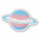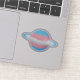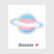 Arte digital de um planeta brilhante nas cores da bandeira transgênero cercada por anéis como Saturno no espaço.