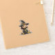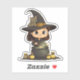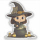 Uma gatinho bonita se senta no chapéu de uma bruxa jovem enquanto ela cria uma poção em seu caldeirão. Este adesivo amigável é excelente para celebrar o Halloween.