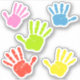 Impressões manuais em tons de rosa, azul, verde, vermelho e amarelo.