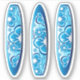 Um decal de vinilo ilustrado com 3 pranchas de penteados alinhados à espera para atingir as ondas. Essas pranchas azuis são decoradas com um tema floral retrô legal dos anos 60.