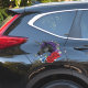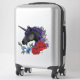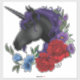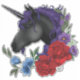 Um unicórnio preto com flores vermelhas, roxas e azuis num pano de fundo roxo claro