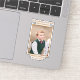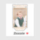O design apresenta a foto que você fornece emoldurada por uma borda dourada. O cabeçalho personalizável é exibido no topo na mesma cor dourada. O nome da criança e a data da primeira comunhão sagrada são apresentados abaixo. O adesivo personalizado assume a forma da imagem conforme mostrado. Uma bela lembrança de um dia especial!