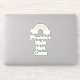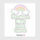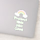 Decal de vinilo com texto "Proteja Crianças Não Armas" no estilo de letra verde da casa da moeda e gráfico arco-íris pastel em fundo roxo.