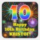Este design de etiqueta de aniversário alegre e empolgante apresenta um grande número "10" com um padrão de inspiração colorida do espectro do arco-íris, juntamente com a mensagem "Feliz 10º aniversário", e um nome personalizado. O plano de fundo apresenta um padrão multicolorido inspirado pela aparência de fogos de artifício comemorativos em explosão. Cartazes divertidos e personalizados como este podem ser dados como presente de aniversário, ou usados enquanto embrulham presentes, ou talvez usados como decoração de festas de aniversário quando celebram o décimo aniversário de alguém. [~Z0000579]