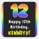 This upbeat and joyful birthday-themed square sticker design features the number “12“ having a multicolor rainbow spectrum inspired gradient pattern, along with the message “Happy 12th Birthday,”, and a personalized recipient name. Stickers like these might be used or given out at a party held in celebration of somebody’s 12th birthday, or perhaps used when preparing invitations or wrapping giftss for such an event. [~Z0000630]