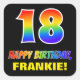 Esse design de aniversário alegre, colorido e divertido apresenta um grande número "18" e a mensagem "FELIZ ANIVERSÁRIO", ambos coloridos com um padrão inspirado no gradiente do espectro do arco-íris, junto com um nome personalizável amarelo ousado. O fundo é preto colorido. Tímulos divertidos como este podem ser usados ao embrulhar presentes que são dados a alguém em comemoração de seu décimo oitavo aniversário, ou talvez possam ser entregues aos participantes em uma festa de aniversário ou celebração. [~Z0000480]
