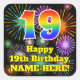 Este design de etiqueta quadrada de aniversário alegre e divertida apresenta um grande número de "19" tendo um padrão de inspiração colorida de gradiente do espectro arco-íris. Também apresenta a mensagem "Feliz 19º aniversário", e um nome personalizado. O plano de fundo apresenta um padrão multicolorido inspirado pela aparência de fogos de artifício comemorativos que explodem. Tímulos divertidos e personalizados como este podem ser dados como presente de aniversário, ou usados enquanto embrulham presentes/presentes, ou talvez usados como decoração de festas de aniversário quando se celebra o 19º aniversário de alguém. [~Z0000579]