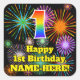 This exciting and fun birthday square sticker design features a large number “1” with a colorful rainbow spectrum gradient inspired pattern, along with the message “Happy 1st Birthday,”, and an editable name. The background features an exciting and colorful bursting celebratory fireworks inspired pattern. Fun, personalized stickers like this might be given as a birthday gift, or used while wrapping presents, or perhaps used as birthday party decorations when celebrating somebody’s 1st birthday. [~Z0000579]