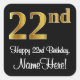 Este elegante, luxuoso e na moda, design de adesivo temático de aniversário, apresenta um grande número ordinal "22", com uma aparência falsa e imitada de ouro, mais a mensagem de saudação de aniversário "Feliz 22 de aniversário" e um nome personalizado em uma fonte estilo script. Também tem um fundo de cor preta. Os adesivos elegantes como este podem ser usados ao embrulhar presentes que são dados a alguém em comemoração do seu vigésimo segundo aniversário, ou talvez possam ser entregues aos convidados numa festa de aniversário. [~Z0000517]