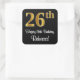 Este design de adesivo quadrado de aniversário sofisticado, elegante e luxuoso apresenta um grande número ordinal "26º", com um visual de ouro imitação/falsa, mais a mensagem de saudação de aniversário "Happy 26th Birthday" e um nome editável em uma fonte estilo script. Também tem um fundo de cor preta. Os adesivos de na moda como este poderiam ser usados para embrulhar um presente de aniversário ou um presente dado a alguém que comemora seu 26º aniversário, ou talvez possam ser entregues aos participantes em uma festa de aniversário. [~Z0000517]