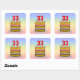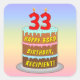 This fun and joyful birthday square sticker design features a cartoon-style depiction of a three-tier birthday cake having numeral-shaped candles on top showing the number “33“, along with the message “HAPPY 33RD BIRTHDAY,”, and a custom recipient name. The background has a multi-color pastel rainbow spectrum inspired gradient pattern. Stickers like these might be given out or used at a birthday party held for somebody who is celebrating their thirty third birthday, or perhaps used when peparing invitations or wrapping presents/gifts for such an event. [~Z0000624]