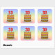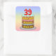 This colorful and fun birthday themed square sticker design features a cartoon-style depiction of a three-tier birthday cake having number-shaped candles on top showing the age “39“, along with the message “HAPPY 39TH BIRTHDAY,”, and a custom recipient name. The background has a multi-color pastel rainbow spectrum inspired gradient pattern. Stickers like these might be used when celebrating somebody’s 39th birthday. [~Z0000624]