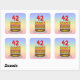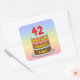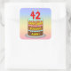 This upbeat and colorful birthday themed square sticker design features a cartoon-style depiction of a three-tier birthday cake having numeral-shaped candles on top showing the number “42“, along with the message “HAPPY 42ND BIRTHDAY,”, and a custom recipient name. The background has a multicolored pastel rainbow spectrum inspired gradient pattern. Cheerful birthday themed stickers like these might be distributed or used at a party celebrating somebody’s 42nd birthday, or perhaps used when wrapping gifts or preparing invitations for such an event. [~Z0000624]