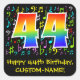 Este design de adesivo de aniversário divertido, colorido e vibrante apresenta um grande número de "44" tendo um padrão inspirado no gradiente do espectro arco-íris. Também apresenta a mensagem "Feliz 44 Aniversário", e um nome editável. Parte do fundo apresenta notas de música coloridas e padrão de símbolos. Os autocolantes com tema de aniversário como este podem ser divertidos de usar como decoração de comemorações de aniversário, ou talvez dar como presente de aniversário, ou talvez ser usados quando se empacotam presentes de aniversário em comemoração de um cantor, de um compositor de música, de um músico ou dos quarenta e quatro anos de alguém. [~Z0000423]