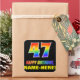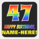 Este design de etiqueta de aniversário divertida, alegre e colorida apresenta um grande número "47" e a mensagem "FELIZ ANIVERSÁRIO", ambos tendo um gradiente de padrão inspirado no espectro do arco-íris, junto com um nome personalizado amarelo ousado. O fundo é preto colorido. Os adesivos divertidos como este poderiam ser usados ao embrulhar um presente de aniversário ou um presente dado a alguém que comemora o seu quarenta e sétimo aniversário, ou talvez seja dado aos participantes numa festa de aniversário. [~Z0000480]