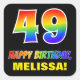 Este design de etiqueta colorida, divertida e alegre aniversário com tema de aniversário apresenta um grande número de "49" e a mensagem "FELIZ BIRTHDAY", ambas coloridas com um padrão inspirado no gradiente do espectro do arco-íris, juntamente com um nome personalizado amarelo ousado. O fundo é preto colorido. Alguns adesivos divertidos como este podem ser usados ao embrulhar presentes que estão sendo dados a alguém em comemoração de seu 49º aniversário, ou talvez sejam dados aos participantes de uma festa ou celebração de aniversário. [~Z0000480]