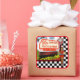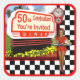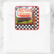 Adesivo quadrado com uma imagem de um sinal retrorreflector de 50, relógio vermelho de diner e um servidor fêmea de 50 de vintage em um tabuleiro de xadrez preto e branco. Consulte o adesivo da data de salvamento correspondente, convite, convite "Sinal de Vazio do Diner Retro 50", cartão "50 Retro Diner Obrigado", envelope e etiqueta. Veja a coleção inteira do Nifty 50 Sticker nos CONVITES | Seção Stickers & Labels