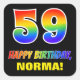 Este design de etiqueta colorida, divertida e alegre aniversário com tema de aniversário apresenta um grande número de "59" e a mensagem "FELIZ ANIVERSÁRIO", ambos tendo um gradiente de padrão inspirado no espectro do arco-íris, juntamente com um nome ousado e amarelo editável. O fundo é preto colorido. Os adesivos divertidos podem ser usados ao embrulhar um presente ou presente em homenagem ao 59º aniversário de alguém, ou talvez possam ser entregues aos participantes numa celebração de aniversário. [~Z0000480]