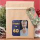 Um adesivo da 60ª festa de aniversário. Com o texto: até 60 na frente, escrito com letras falsas de balões de ouro. Fundo azul com confete de ouro. A cor azul é irregular. Modelo para sua foto.