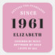 Um design de adesivo clássico personalizado para aquela celebração de aniversário para um nascer especial de mulheres em 1961 e aos 60 anos. Adicione o nome a este design cor-de-rosa, branco e preto estilo retrorreflector vintage para um presente de aniversário de 60 anos personalizado. Edite facilmente o nome e o ano com o modelo fornecido. Um maravilhoso presente de aniversário rosa. Mais presentes e suprimentos para a 60ª festa disponível na loja.