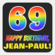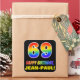 Este design de etiqueta de aniversário alegre, divertida e colorida apresenta um grande número "69" e a mensagem "FELIZ ANIVERSÁRIO", ambos tendo um gradiente de padrão inspirado no espectro do arco-íris, junto com um nome personalizado amarelo ousado. O fundo é preto colorido. Os adesivos divertidos podem ser usados ao embrulhar um presente ou presente em honra do 69º aniversário de alguém, ou talvez possam ser entregues aos participantes numa festa de aniversário. [~Z0000480]