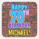 Este design de etiqueta de aniversário divertida apresenta a mensagem "FELIZ 70 BIRTHDAY", tendo um olhar colorido, vibrante, de arte urbana de rua e grafite inspirado, junto com um nome de destinatário editável. O plano de fundo apresenta um padrão inspirado pela aparência de uma parede de tijolos. Tangas vibrantes, divertidas e personalizadas como esta podem ser dadas como presentes de aniversário, ou usadas enquanto embrulham presentes/presentes, ou talvez usadas como decoração de festas de aniversário quando se celebra o aniversário de 70 de alguém. [~Z0000535]