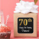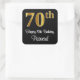 Este design de autocolante quadrado sofisticado, elegante e luxuoso, com tema de aniversário, apresenta um grande número ordinal "70" com um padrão de gradação tipo ouro imitação/falsa, mais a mensagem de saudação de aniversário "Feliz 70 aniversário" e um nome personalizado em uma fonte estilo script. O fundo é preto colorido. Tímulos luxuosos como este podem ser usados ao embrulhar um presente de aniversário ou presente dado a alguém que comemora seu setuagésimo aniversário, ou talvez possam ser entregues aos participantes em uma festa ou celebração de aniversário. [~Z0000517]