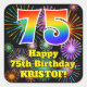 Este design de adesivo quadrado divertido e empolgante, com tema de aniversário, apresenta um grande número de "75" tendo um padrão de inspiração colorida de gradiente do arco-íris. Também apresenta a mensagem "Feliz 75.º aniversário", e um nome personalizável. O fundo apresenta um padrão inspirado em fogos de artifício celebratórios coloridos e em explosão. Tangas coloridas, divertidas e personalizadas como esta podem ser dadas como presentes de aniversário, ou usadas enquanto embrulham presentes, ou talvez usadas como decoração de festas de aniversário quando celebram o 75º aniversário de alguém. [~Z0000579]