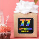 Este design de etiqueta de aniversário alegre, divertida e colorida apresenta um grande número "77" e a mensagem "FELIZ ANIVERSÁRIO", ambos tendo um gradiente de padrão inspirado no espectro do arco-íris, junto com um nome personalizado amarelo ousado. O fundo é preto colorido. Os adesivos divertidos como este podem ser usados ao embrulhar um presente de aniversário ou presente dado a alguém que comemora seus setenta e sete anos, ou talvez possam ser entregues aos participantes em uma celebração ou festa de aniversário. [~Z0000480]