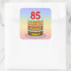 Este design de autocolante quadrado com tema de aniversário, bem ilustrado, apresenta uma representação em estilo cartoon de um bolo de aniversário de três níveis, com velas em forma numérica no topo, mostrando o número "85", juntamente com a mensagem "HAPPY 85TH BIRTHDAY", e um nome de destinatário personalizado. O fundo tem um espectro multicolorido de arco-íris pastel inspirado em gradiente. Os adesivos como estes podem ser usados para celebrar o oitenta quinto aniversário de alguém. [~Z0000624]