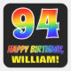 Este design de adesivo alegre, divertido e colorido com tema de aniversário apresenta um grande número "94" e a mensagem "FELIZ ANIVERSÁRIO", ambos coloridos com um padrão inspirado no gradiente do espectro do arco-íris, juntamente com um nome ousado e amarelo personalizável. O fundo é preto colorido. Alguns adesivos divertidos como este podem ser usados ao embrulhar presentes que estão sendo dados a alguém em comemoração de seu 94° aniversário, ou talvez sejam entregues aos participantes em uma comemoração de aniversário. [~Z0000480]