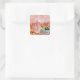 Tudo é rosa e tons quentes do fundo ao cabelo da jovem, céu rosa, tulipas rosa, brinquedos de pelúcia e etc