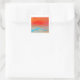 Um design abstrato de um pôr do sol oceânico com cores ousadas em vermelho, laranja, ciano, azul e bege.