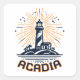 Acadia National Park has numerous lighthouses such as Bass Harbor Head, Baker Island, and Bear Island. This elegant design is a lighthouse with the word Acadia in it.