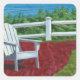 This vivid oil pastel painting features a white Adirondack chair on a red brick padiatio overlooking Cape Cod. Brilliant green, blue, red, and yellow create a stunning summer seascape on the New England Coast.