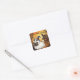 Adesivo quadrado de Halloween com um gráfico criado com assistência de IA de um pug fofo em seu traje de "Fantasma" para doces ou travessuras com uma casa assombrada ao fundo. Personalize com sua própria mensagem de Halloween em texto curvo no topo