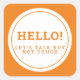 Alô âmbar de casamento à distância social. Ajude seus convidados a se sentirem seguros e deixe que outros convidados saibam que você precisa que eles fiquem longe para se proteger a si mesmo ou a seus convidados mais vulneráveis. O adesivo de casamento laranja-âmbar do código lê Olá! Vamos, mas não toque. Ideal para adicionar a um kit de casamento de segurança antivírus convidado ou kit de eventos. Posters e instruções correspondentes também estão disponíveis. Projetado por www.mylittleedenweddings.com
