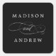 Lindos adesivos de casamento personalizados, com uma fonte elegante e marcadores para os nomes dos casais contra um fundo preto. Use os adesivos personalizados para favores de casamento, selos de envelopes, reservas de sucata e muito mais!