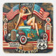 A classic-style photograph of a stunning woman in a short, elegant white dress, striking a seductive pose next to a glossy red convertible sports car.