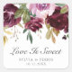 Um adesivo de favorito floral moody com uma borda superior com rosas pintados de cor d'água em ameixa e roxo e a mensagem "Love Is Sweet". Abaixo estão seus nomes e data. Estes adesivos são perfeitos para um casamento no outono ou outono e são uma forma excelente de adicionar um toque pessoal aos vossos favores.
