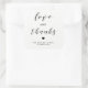 Esses adesivos de casamento na moda apresentam as palavras "amor e obrigados" em uma elegante tipografia moderna preta em um fundo preto.
